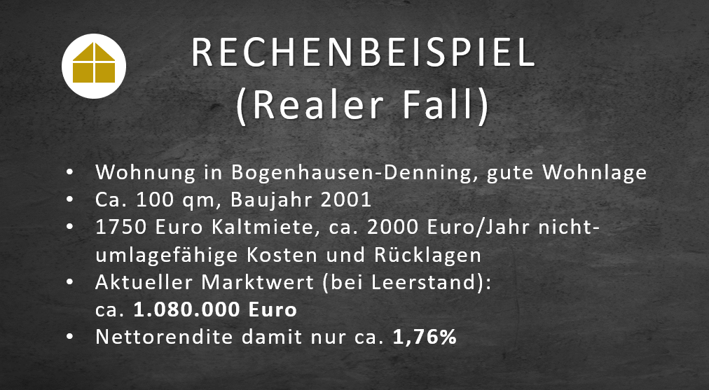 In der Theorie wäre all dies durch entsprechende Mieteinnahmen abgegolten. Allerdings gibt es dafür klare Grenzen durch die bei uns gültige Mietpreisbremse. Der starke Anstieg der Immobilienpreise über die letzten Jahre bedeutet damit effektive Mietrenditen von unter 2%.